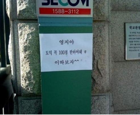 공개된 사진을 보면 어느 시험장의 응원 메시지로 내용은 "영지야 토익 꼭 100점 받아야 돼. 이따 보자"라고 적혀 있다.