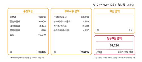 SK텔레콤은 또 청구서를 받아본 가입자들이 고객센터에 가장 많이 문의하는 항목인 '단말기 할부금액'을 부가사용금액 표시란의 최상단에 배치하기로 했다. 통신요금과 부가사용금액을 합한 '최종 납부 금액'도 청구서 앞·뒷면에 표기한다.