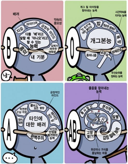 또 AB형은 A와 B가 싸우는 모습이 그려져있어 A형과 B형의 성격을 모두 가지고 있음을 보여준다.