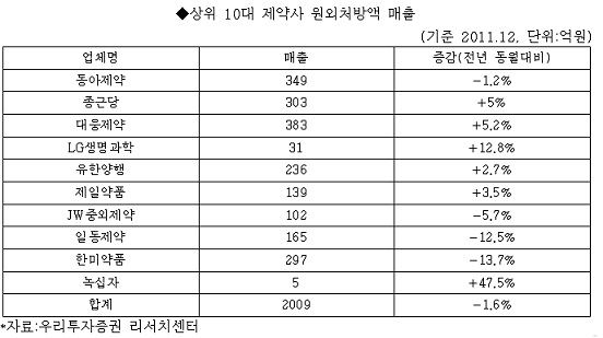 19일 우리투자증권 등 증권업계가 발표한 2011년 12월 제약사 원외처방액 보고서에 따르면 전체 제약사 원외처방액은 8천80억원으로 전년 동기대비 0.8% 증가에 머물렀다. 10월 7.4%, 11월 6.2% 등과 비교할 때 상당히 낮은 수치다.