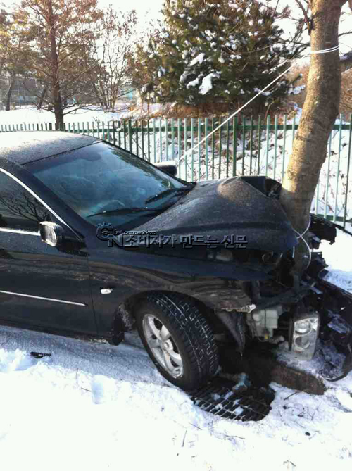 비포장 도로의 빙판길이라 10km/h 이하로 운행중 포장도로로 연결되는 부위에서 갑자기 굉음과 함께 핸들, 브레이크, 기어 모두를 제어할 수 없는 상태로 급발진이 됐습니다. RPM은 5000정도로 올라가면서 순간 아무것도 보이지 않고 에어백만 앞으로 튀어나왔다는 군요.