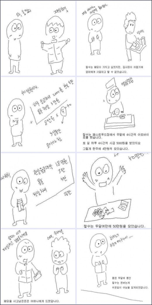 만화에서 주인공 철수는 유행하는 40만원 짜리 패딩 점퍼를 사기 위해 아르바이트를 한다.