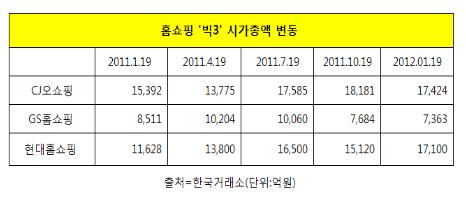 GS홈쇼핑은 홈쇼핑 업계 빅3 중 최근 1년 사이 유일하게 시가총액이 줄어드는 불명예도 안았다. 지난해 초 시가총액은 8천억원대였지만 미끄러진 주가 탓에 1년사이 1천억원 가량의 시가총액이 증발해버렸다.