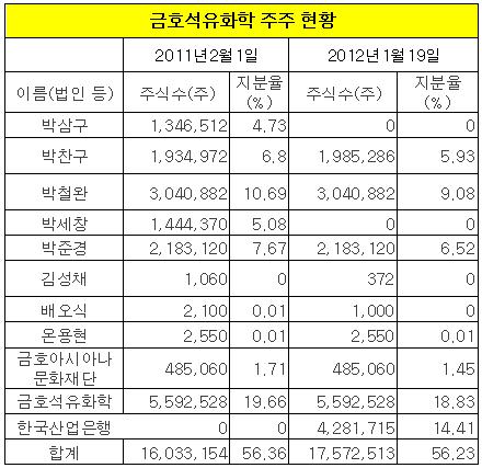 19일 현재 금호석화의 최대주주는 한국산업은행(14.41%)이다. 산업은행은 지난해 12월 전환사채를 금호석화 주식으로 전량 전환시키며 최대주주로 등극했다. 산업은행은 구조조정(자율협약) 기업에 대한 유동성 공급 및 재무구조 개선 목적으로 금호석유화학 지분을 인수했다.