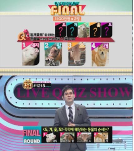 이날 방송에서 ‘도개걸윷모 해당 동물’ 문제는 걸이 양이란 것만을 공개하고 남은 해당동물을 순서대로 나열하는 방식으로 진행됐다. 이 문제는 상금 1,500 만원이 걸린 파이널 문제였던 것.