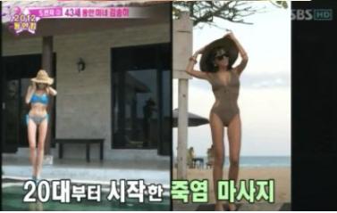 20대 중반부터 꾸준한 운동과 죽염 마사지로 몸매 관리를 해왔다는 김 씨는 출연진 모두의 찬사를 받으며 동안미모를 자랑했다.