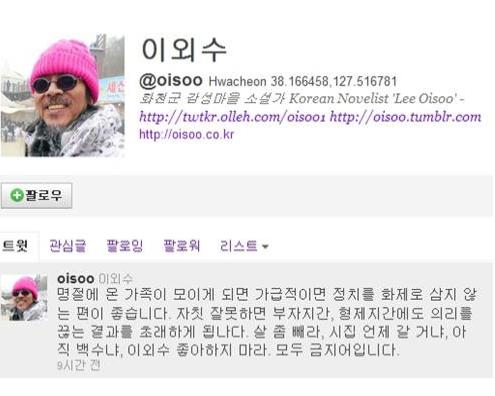이외수는 22일 오전 자신의 트위터에 "명절에 온 가족이 모이게 되면 가급적 정치를 화제로 삼지 않는 편이 좋습니다"라는 글을 올렸다.