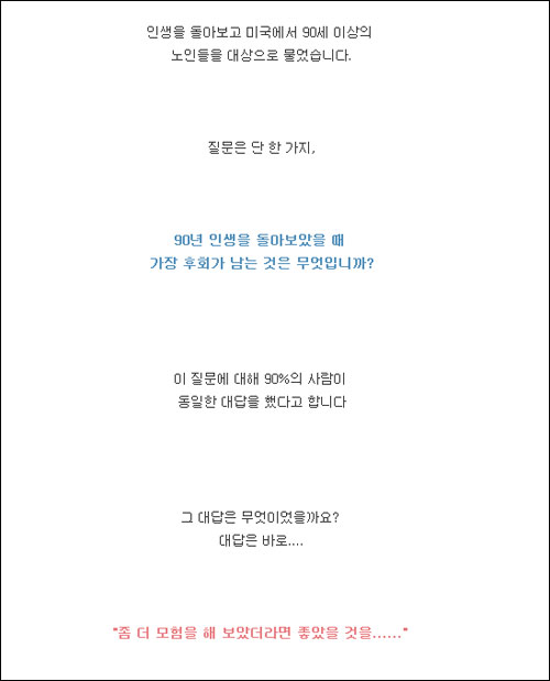 미국 90세 이상 노인들을 대상으로 조사한 이 글은 '90년 인생을 돌아보았을때 가장 후회가 남는 것은 무엇입니까?'라는 질문에 대한 답을 담고 있다. 이 질문에 90%의 노인들이 "좀 더 모험을 해 보았더라면 좋았을 것을…"이라고 동일하게 답했다. 이같은 답변에 네티즌들이 공감을 나타내며 교훈을 얻고 있는 것.