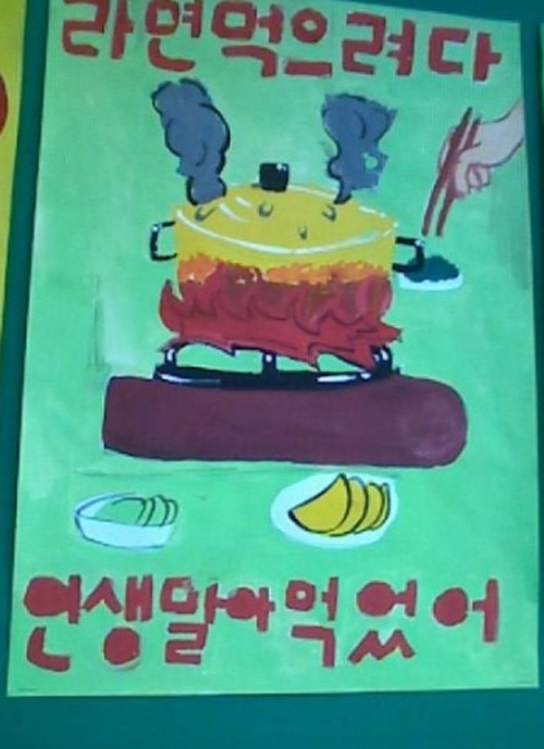 최근 각종 온라인 커뮤니티 게시판에는 ‘초등학생의 불조심 포스터’라는 제목의 사진이 게재됐다. 사진 속 포스터에는 ‘라면 먹으려다 인생 말아 먹었어’라는 문구과 함께 끓고 있는 라면 냄비가 그려져 있다. 초등학생에 걸맞지 않는 직설적이고 현실적인 화법이 폭소를 자아낸다.