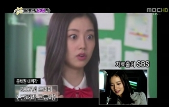 문채원은 22일 방송된 '섹션TV 연예통신'에서 과거 이민호와 함께 출연했던 자신의 데뷔작 드라마를 감상했다. 2007년 방송된 SBS 드라마 '달려라 고등어' 속 문채원은 교복차림에 긴 생머리 모습이다. 청순한 매력에 통통한 볼살이 눈에 띄었다. 이를 본 문채원은 "요즘에 선호하는 V라인이 아니다"라며 애교섞인 불만을 털어놨다. (사진-MBC 방송캡쳐)
