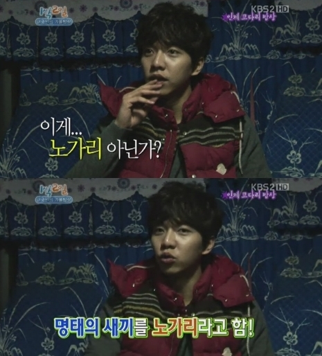 1월22일 방송된 KBS 2TV ‘해피선데이-1박2일’에서 이승기는 강원도 인제 황태마을로 코다리밥상을 찾아 나섰다. 인제로 이동하던 중 이승기는 명태, 황태, 북어, 코다리 등에 대해 예습 했다. 그러던 중 제작인이 이승기에게 노가리에 대해 언급했다. 이승기는 명태의 새끼를 말하는 노가리의 뜻을 모른채 '수다'를 가리키는 속어로만 알고 있었다. 이에 이승기는 손동작으로 '수다'를 표현했다.