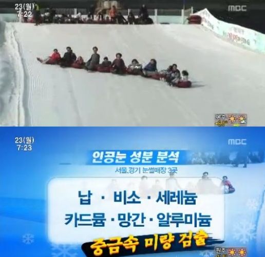 23일 방송된 ‘MBC 뉴스데스크’의 보도를 통해, 눈썰매장의 인공눈이 얼마나 깨끗한지 여부의 결과가 발표됐다.