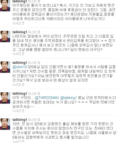 설전은 지난 23일 양준혁이 트위터에 양준혁 야구재단 후원방법을 소개하는 과정에서 강병규가 "꿈나무 누구에게 얼마를?"이라고 물으며 시작됐다.