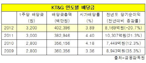 배당금총액은 2009년 3천604억원에서 2010년 3천562억원, 2011년 3천829억원, 올해 4천24억원으로 매해 높아지고 있다.