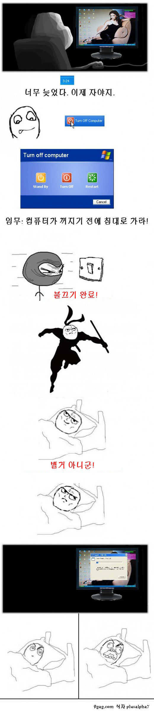 만화 속 주인공은 컴퓨터를 끄고 자려고 한다. 이어 종료 버튼을 누른 주인공은 누르고 알아서 컴퓨터가 꺼지겠지 하며 재빨리 이불 속으로 들어간다.