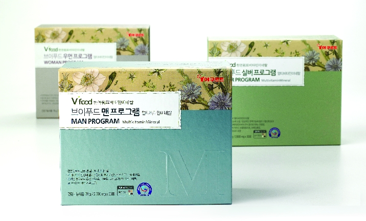 ‘브이푸드 프로그램 멀티 비타민 미네랄’은 성별 및 연령대별로 최적화된 비타민 미네랄을 제공 하는 것이 특징. 중년 남성과 여성, 60대 이상 실버계층으로 고객층을 세분화해 특성별 필요 영양소를 보강하고 기능성을 높였다.