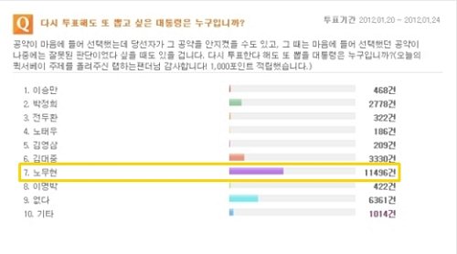 이어 '다시 뽑고 싶은 대통령이 없다'는 의견이 6,361건(24%)의 득표수를 기록하며 2위로 꼽혔으며 3위는 故 김대중 전 대통령이 3,330건(12%), 4위는 박정희 전 대통령이 2,778건(10%)를 차지했다.