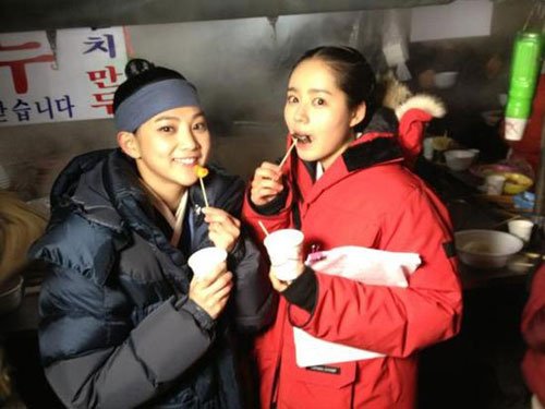 공개된 사진 속에는 윤승아와 한가인이 드라마 촬영장에서 두터운 패딩 점퍼를 입고 떡볶이와 순대를 먹고 있는 모습이 담겨 있다.