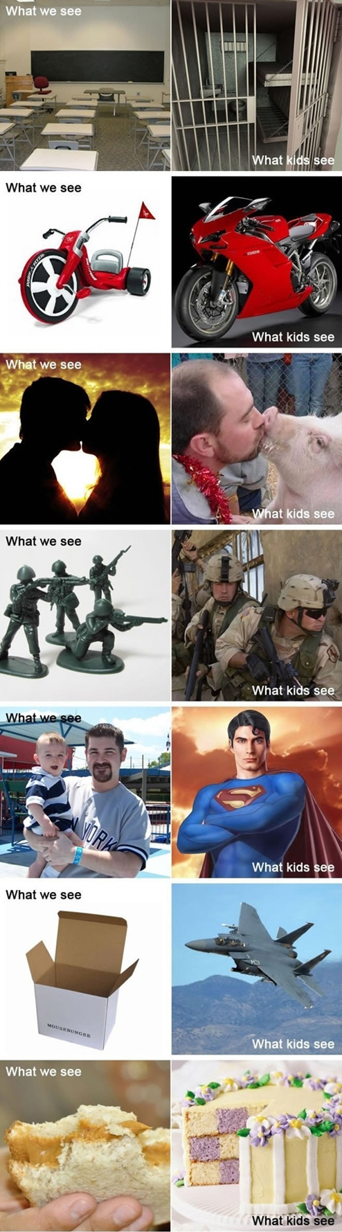 게시물을 살펴보면 학교 교실은 아이들의 눈에는 감옥으로 보이고, 침대는 놀이기구, 장난감 오토바이는 아이들의 눈에는 멋진 오토바이로 보인다.