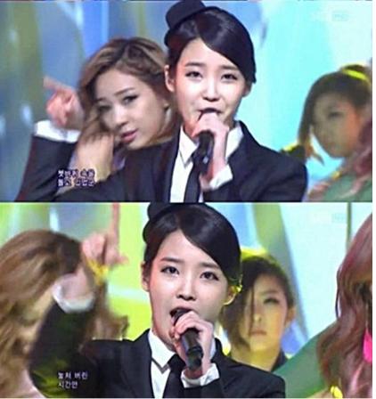 이날 아이유는 최근 입대발표 후 활동을 중단한 같은 소속사 써니힐 멤버 장현을 대신해 남장을 하고 무대에 오른 것이다.