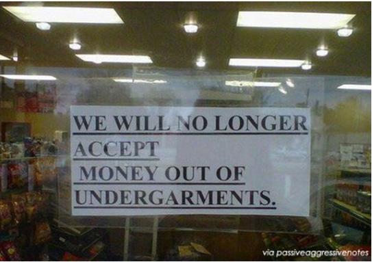 이 게시물은 한 가게의 주인이 가게 유리문에 써 붙여 놓은 글로“속옷에서 꺼내는 돈은 더 이상 받지 않도록 하겠습니다(WE WILL NO LONGER ACCEPT MONEY OUT OF UNDERGARMENTS)”라는 문구가 네티즌들의 웃음을 자아내고 있다.