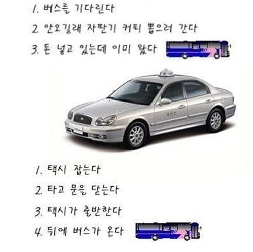 두 번째는 버스가 안 와서 택시를 잡았는데 택시 뒤에 버스가 왔다 ‘내돈!’
