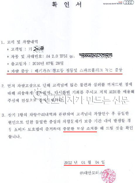 기 씨는 5회 째 수리 후에도 동일 증상 발생 시 즉각적인 차량 교환 및 환불을 약속하는 확인서를 요구했지만, 회사 측은 그런 내용은 담을 수 없다며 '충분한 보상 조치'라는 두루뭉술한 내용을 기재해 넘겨줬다.