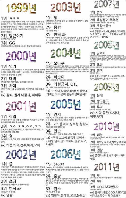 최근 인터넷에서 화제가 되고 있는 ‘역대 인터넷 유행어’ 게시물은 1999년부터 2011년까지의 인터넷에서 자주 쓰인 유행어들을 순위별로 정리한 것이다.