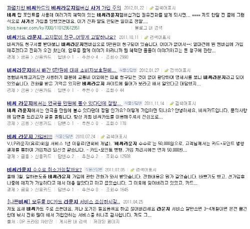 실제로 포털사이트에는 비씨 라운지 멤버십 연회비 청구에 대한 불만 글을 심심치 않게 찾아 볼 수 있다. 소비자가 만드는 신문에도 이와 비슷한 시기 비씨 라운지의 회원 유치 방식에 사기성이 짙다는 제보가 접수됐다.