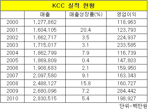 반면 2000년부터 2010년까지 KCC가 본업으로 벌어들인 매출은 1조2천788억원에서 2조8천300억원으로 221.3% 늘어나는데 그쳤다. 영업이익은 1천189억원에서 1천989억원으로 겨우 67.2% 늘어났다.