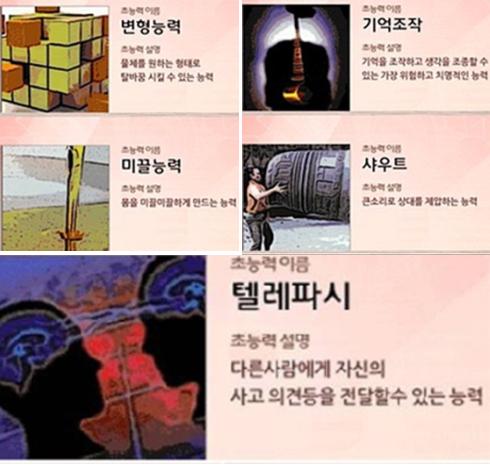 테스트에서 알려주는 초능력에는 ‘텔레파시’, ‘마음투시력’, ‘환각력’, ‘괴심력’, ‘분신력’, '기억조작', '변형'등 다양한 종류의 초능력들이 있다.