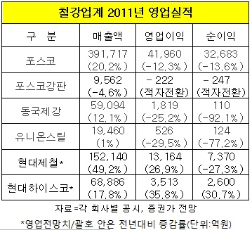 철강업계 1위인 포스코도 매출은 전년보다 20.2% 증가한 반면, 영업이익과 순이익은 각각 12.3%, 13.6% 감소했다. 계열사인 포스코강판은 매출액 9천562억원으로 전년대비 4.6% 감소했고, 영업이익과 순이익은 각각 -22억원, -247억원으로 적자전환 됐다.