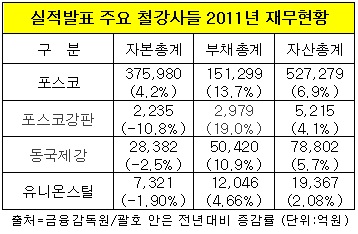지난해 적자 전환된 포스코강판은 자본총액이 10.8% 감소된 반면 부채 규모는 19%나 늘어났다. 동국제강, 유니온스틸도 자기자본이 2% 안팎으로 감소하고 부채총액은 2.5~5배 불어났다. 포스코 역시 자기자본이 4.2% 증가할 동안 부채총액은 13.7% 증가했다.