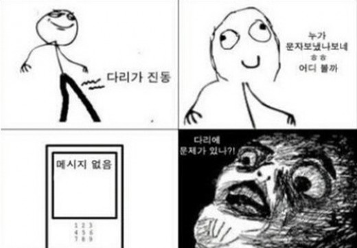 그러나 핸드폰에는 '메시지 없음'이란 문구가 떠 있고 이 남성은 기괴한 표정을 지으며 '다리에 문제가 있나'라고 생각해 웃음을 유발한다.
