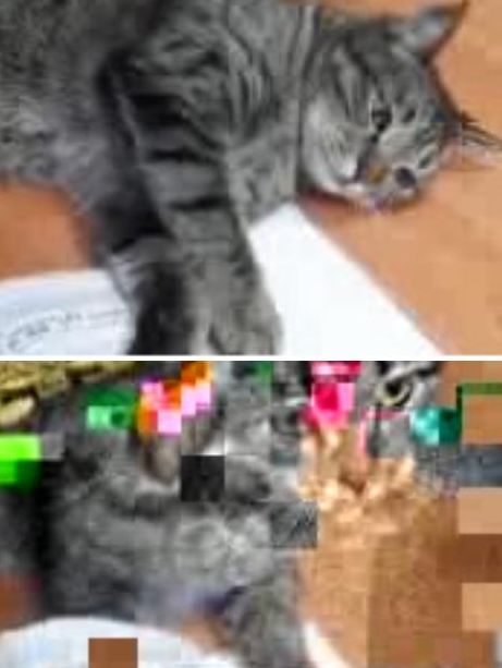 ▲ 움직임이 없는 상태의 영상화면(위)와 약간의 움직임에도 모자이크 상태로 돌변하는 화면.