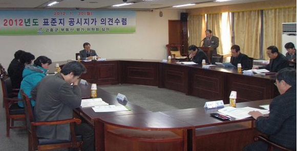 고흥군(군수 박병종)은 토지특성조사 실시를 위해 지난 1월 30일 2012년도 국토해양부에서 선정한 표준지 4천109필지에 대한 부동산 평가위원회를 개최하고, 공시지가의 평가가격 적정여부에 대한 의견청취 등 표준지 공시지가(안)에 대해 심의했다.