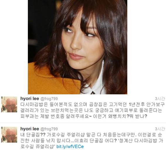 이효리는 3일 오후 자신의 트위터에 "내 단골집?? 가로수길 주얼리샵 말곤 다 처음 듣는데구만. 이런 걸로 순진한 사람들 낚지 맙시다"라는 글을 올렸다.