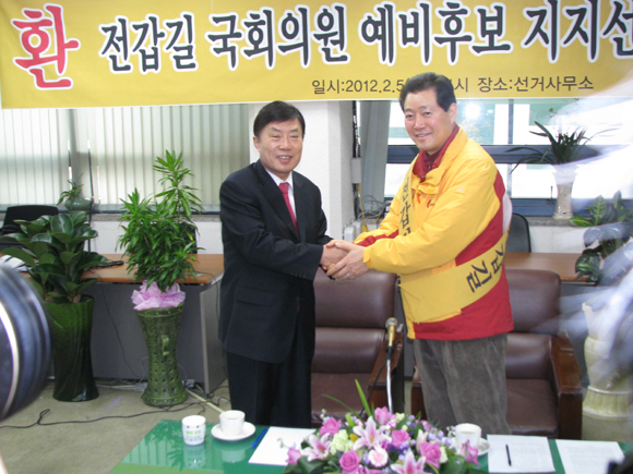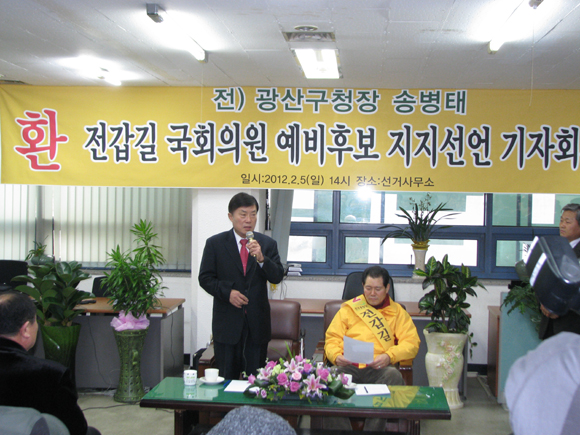 송 전 구청장은 이날 오후 2시 전갑길 후보 사무소에서 지지자·시민 등 500여명이 참석한 가운데 ‘총선 불출마 및 전갑길 후보 지지선언 기자회견’을 갖고 민주통합당 광산구 갑 전갑길 후보를 지지한다고 밝혔다.