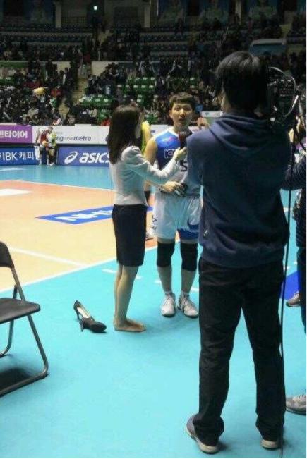 이는 이 '매너발 리포터'가 곽동혁과 키를 맞추기 위해서라기 보다는 배구코트 바닥 때문에 구두를 벗었을 가능성을 제기하고 있기 때문이다.