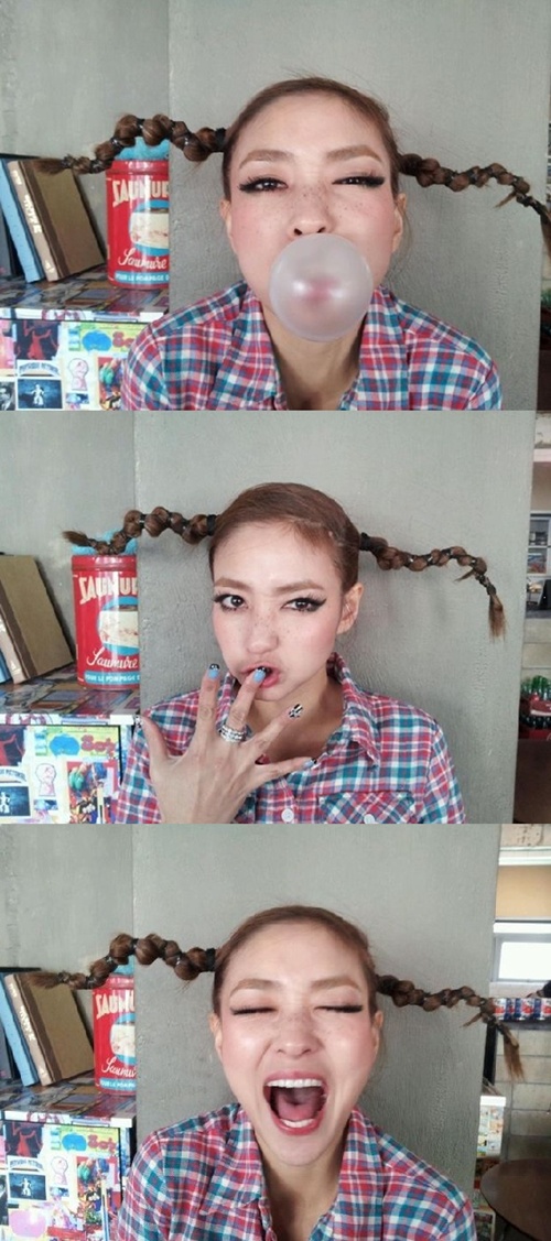 진재영은 삐삐 머리를 하고 볼에는 주근깨를 그려 넣었다. 여기에 풍선껌을 불고 익살맞은 표정을 지어 귀여움을 더했다.