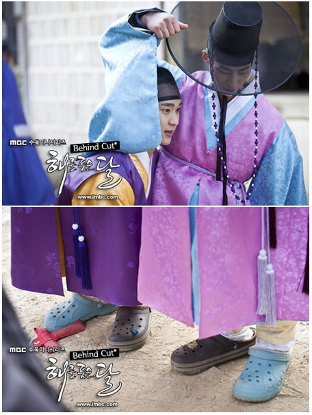 특히 극중 왕과 호위무사로 호흡을 맞추고 있는 김수현과 송재림이 색이 다른 같은 신발을 한 짝씩 나눠 신고 있는 모습으로 친분을 과시했다.