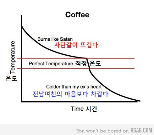 이 커피 온도 그래프는 처음에는 ‘사탄 같이 뜨거운’ 커피였다가 적정온도는 짧은 시간 유지되다 금방 식어버려 헤어진 전 여자 친구보다 차가운 온도가 된다고 설명하고 있다.