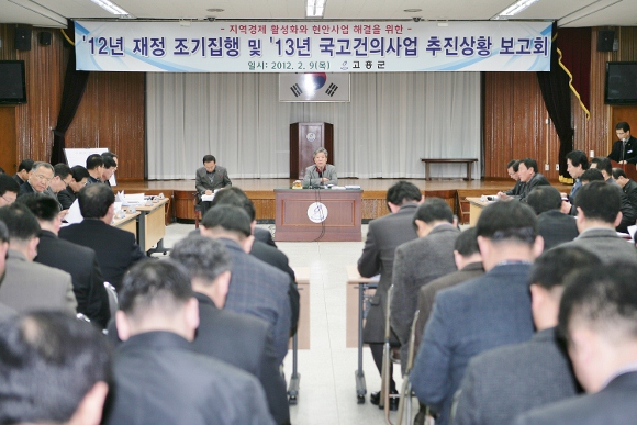 고흥군(군수 박병종)은 9일 군청대회의실에서 박병종 군수를 비롯한 담당급 이상 공무원 110여명이 참석한 가운데 재정 조기집행 및 내년도 국고 건의사업 추진 상황을 점검하는 보고회를 개최했다.
