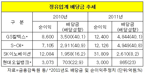 현대오일뱅크도 지난해 3천억원이 넘는 순이익을 거둔 것으로 전해져 2010년과 비슷한 수준에서 배당금이 지급될 전망이다.