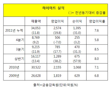 영업이익률은 지난 4분기 5.8%를 기록하며 2011년 8∼9%의 연간 예상치를 뚝 떨어뜨려 놓았다. 하이마트는 지난해 상반기 8%, 3분기 8.5%의 영업이익률을 기록했었다.