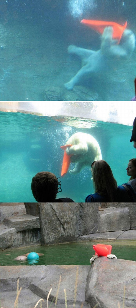 원뿔형 장애물을 빼내려 애쓰는 북극곰의 모습이 안타까움과 웃음을 자아낸다.