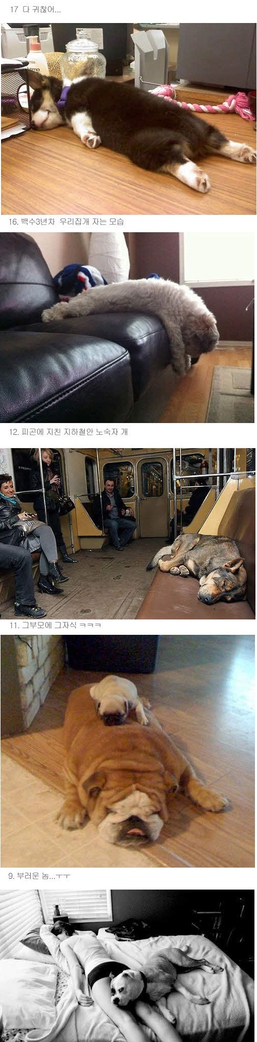사진 속에는 강아지들의 잠자는 자세와 자세에 대한 설명이 덧붙여져 네티즌들의 공감을 자아낸다.