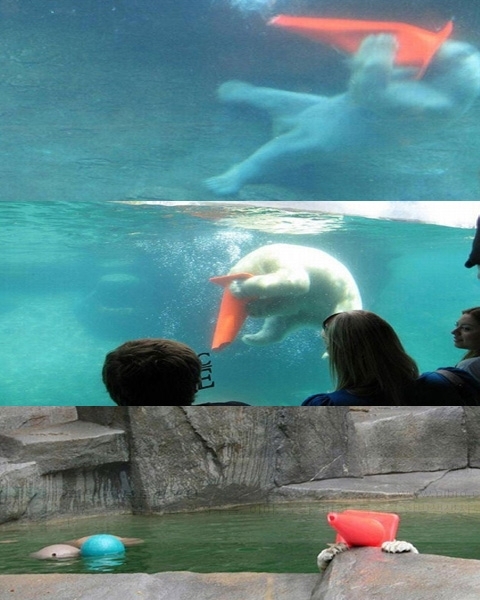 공개된 곰한테 주면 절대 안되는 것 사진은 귀여운 북극곰은 원뿔 모형의 러버콘에 머리가 끼어 안감힘을 쓰고 있는 모습이다. 거대한 몸에 비해 작은 얼굴 덕에 러버콘에 쏙 들어가버려 아등바등 고생을 하고 있는 것.
