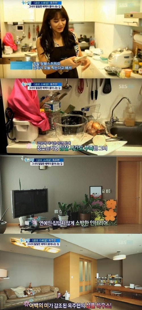 옥주현의 집은 화려한 것보다는 실용성을 강조한 소박한 인테리어가 돋보였다. 싱크대에는 설거지거리가 잔뜩 쌓여있는 모습으로 인간적인 매력을 심어주기도 했다.