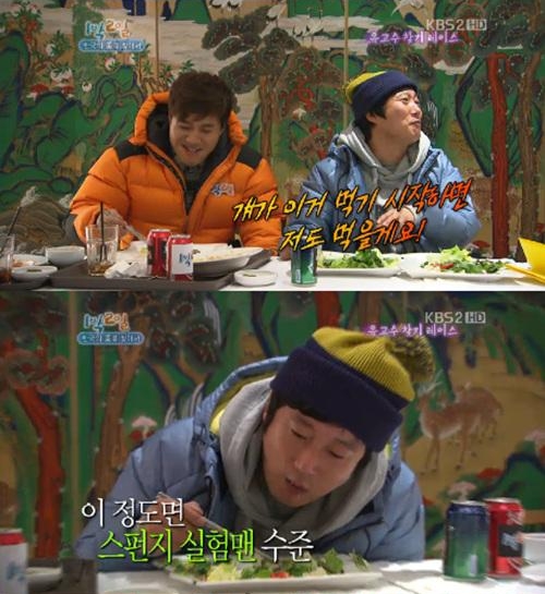 이수근은 은지원, 이승기, 엄태웅 등 멤버들이 먼저 출발한 가운데 샐러드를 끊임없이 먹었다. 샐러드를 흡입하던 이수근은 급기야 "염소 한 마리 갖다 달라. 염소가 먹기 시작하면 나도 먹겠다"고 하소연했다. 또 "입에서 풀 냄새가 날 정도다"라며 울상을 지어 웃음을 자아냈다. (사진-KBS 방송캡쳐)